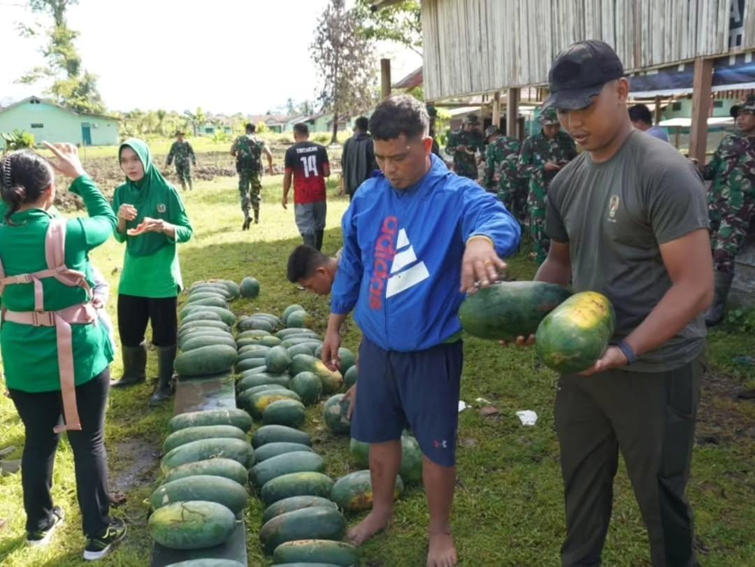 Dengan semangat gotong royong, para prajurit dan anggota Persit tampak antusias memetik semangka yang sudah matang sempurna. Suasana kebun penuh dengan canda tawa dan kegembiraan, mencerminkan eratnya ikatan kekeluargaan dalam satuan.