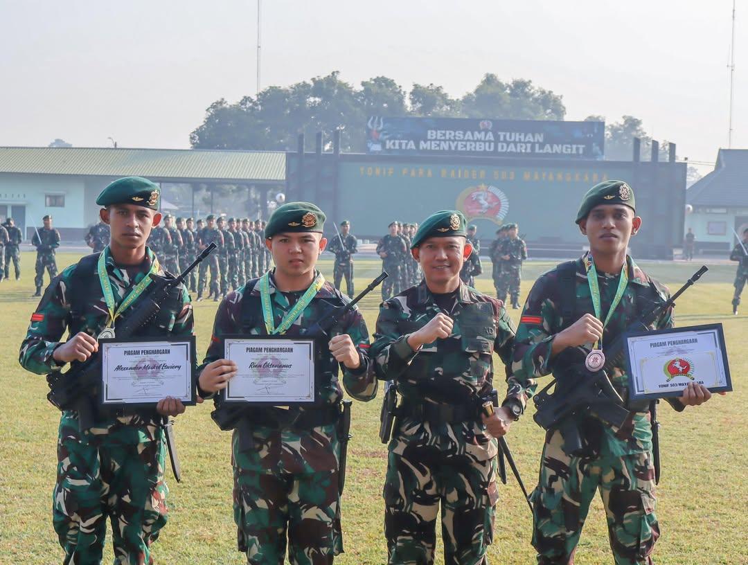 Pada upacara bendera yang penuh khidmat, Letkol Inf Windu Kuntoro, S.I.P., Komandan Yonif 503Mayangkara, memberikan apresiasi langsung kepada tiga prajurit terbaik yang berhasil mengharumkan nama Satuan dalam ajang Pekan Olahraga Provinsi (Porprov) IX Jawa Timur.