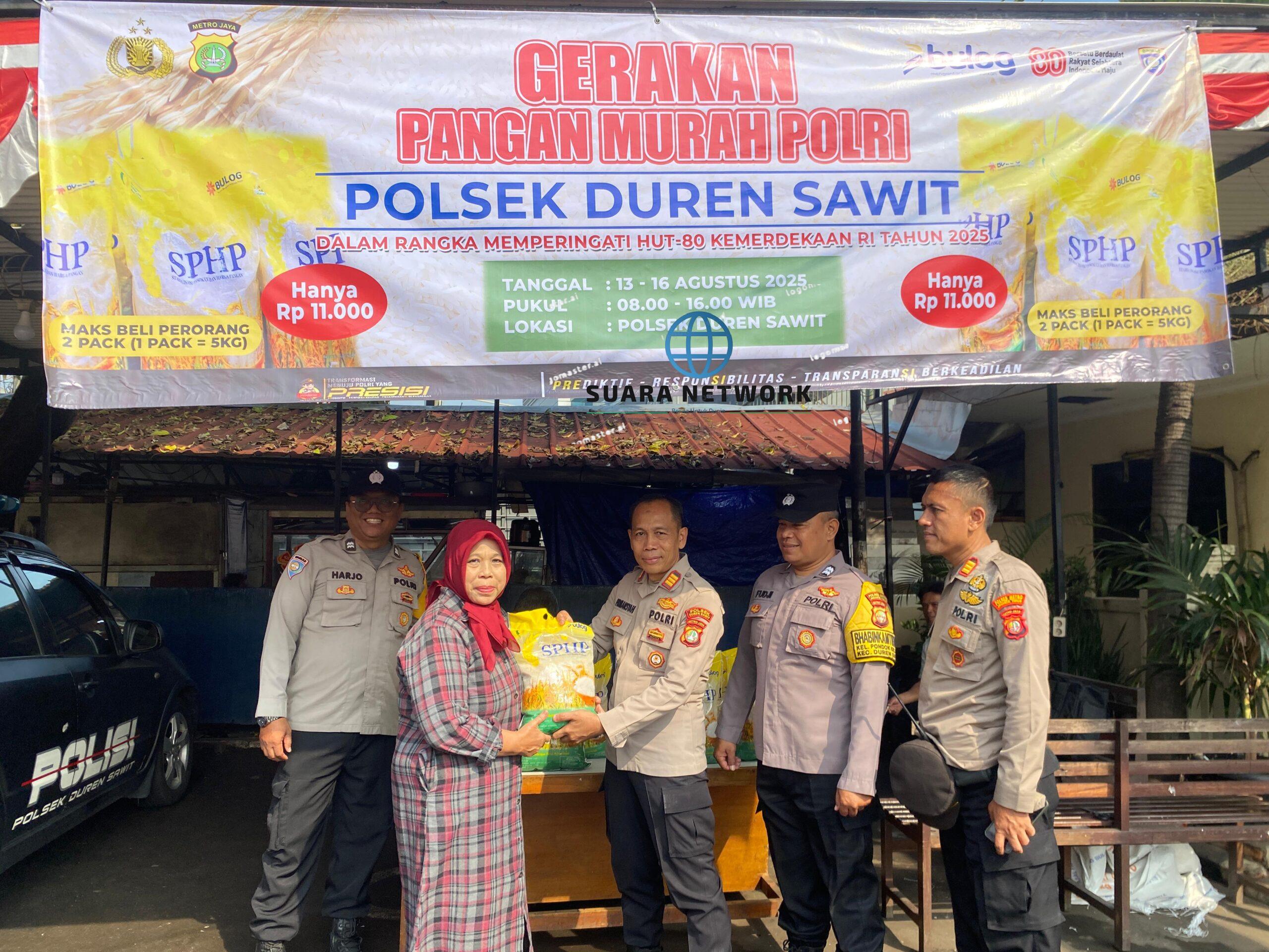 Rabu pagi, 13 Agustus 2025, halaman Polsek Duren Sawit di Jalan Raya Kalimalang dipenuhi warga yang datang untuk mendapatkan beras murah melalui program Gerakan Pangan Murah Polri.