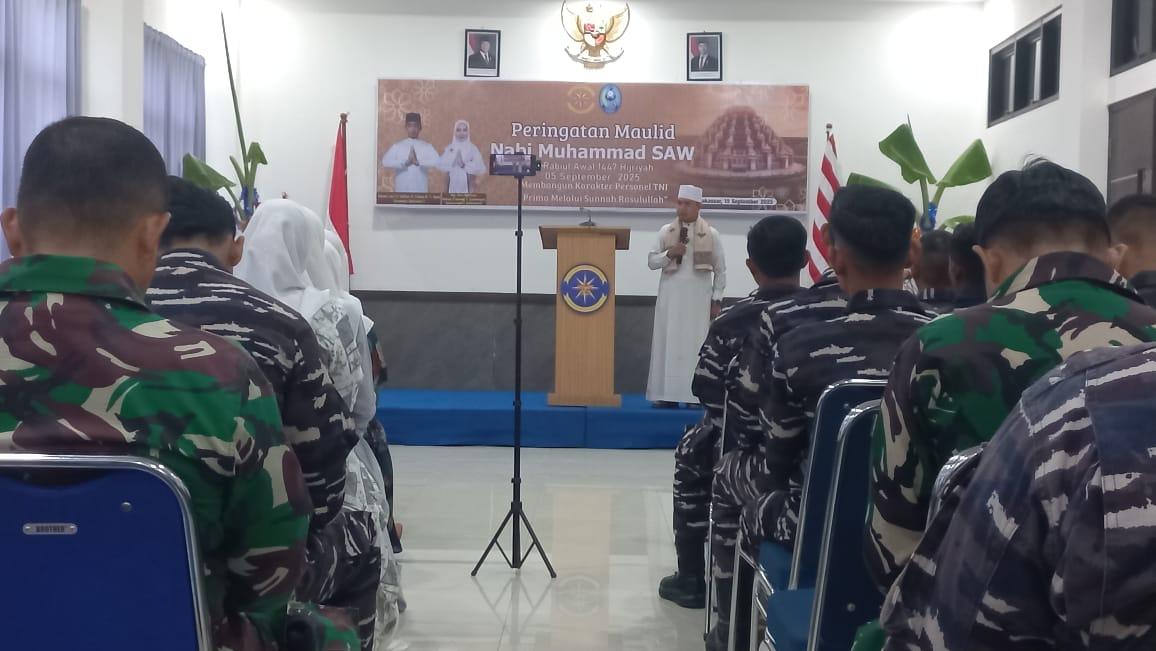 TNI AL, Makassar,- Keluarga Besar Satuan Lintas Laut Militer (Satlinlamil) 3 Kolinlamil Peringati Maulid Nabi Mukammad SAW 12 Rabiul Awal 1447 H/2025 M, dengan tema “Membangun Karakter Personel TNI Prima Melalui Sunnah Rasulullah”, bertempat di Ruang Rapat Mako Satlinlamil 3, Jalan Teuku Umar, Kota Makassar, Senin (15/9/2025).