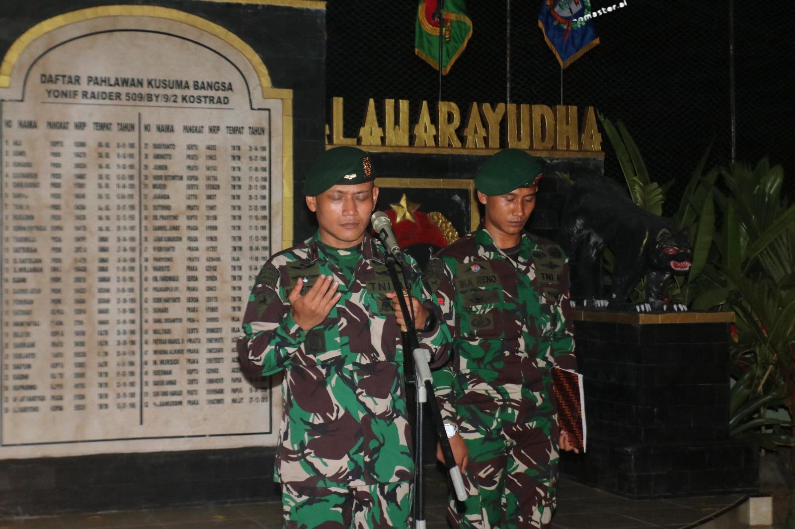 Malam yang hening semakin bermakna ketika seluruh prajurit Yonif 509 Kostrad menggelar Renungan Suci. Cahaya obor yang berpijar menjadi saksi bisu, menyatukan doa, harapan, dan tekad para Ksatria Condromowo agar senantiasa siap menjadi tameng bangsa, menjaga NKRI yang bersatu dan berdaulat. (Penkostrad).