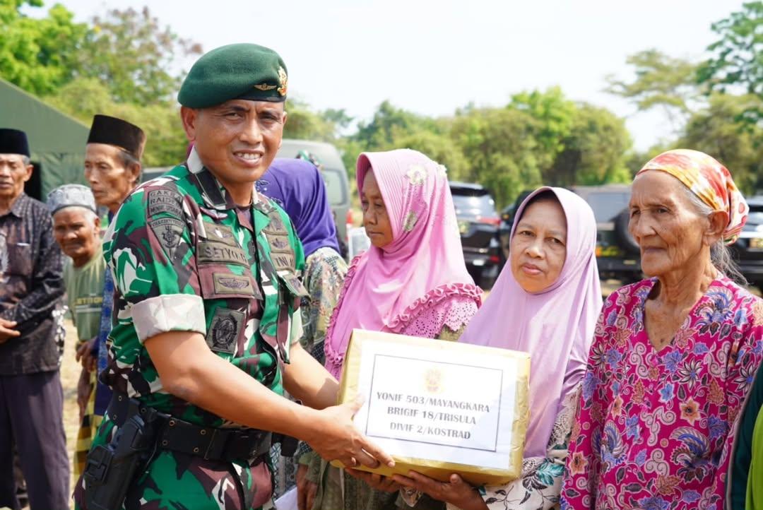 Meski terbiasa dengan disiplin dan ketegasan di medan latihan, para prajurit menunjukkan sisi lain dari jiwa keprajuritan: kepedulian dan kasih sayang kepada sesama. Dengan senyum tulus dan tangan terbuka, mereka menyapa warga, menyerahkan paket Sembako dan berbincang hangat dengan masyarakat setempat.