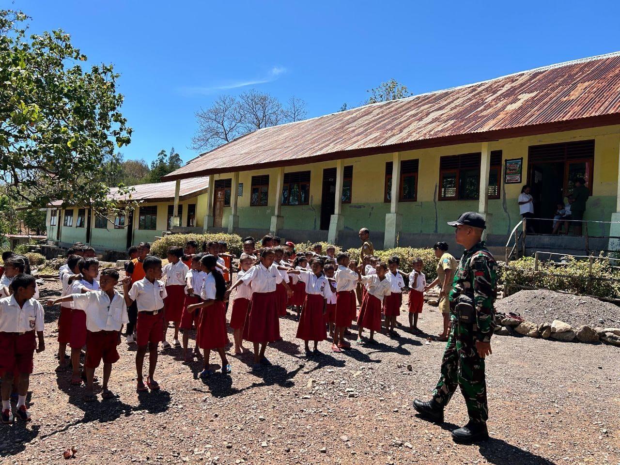 Oelbinose – Prajurit Satgas Pamtas RI-RDTL melaksanakan kegiatan anjangsana sekaligus membagikan buku bacaan keagamaan, serta melatihkan kedisiplinan di SDN Oelbinose yang berada di Desa Kasinifu, Kec. Mutis, Kab. TTU. Selasa (1/10)