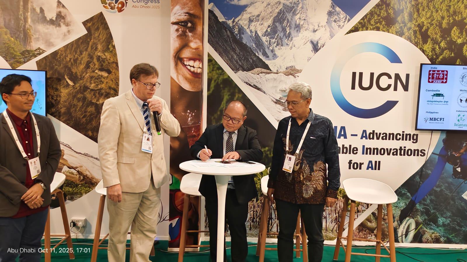 Penandatanganan kerja sama ini disaksikan secara langsung oleh Direktur Jenderal Konservasi Sumber Daya Alam dan Ekosistem Kementerian Kehutanan Republik Indonesia (Dirjen KSDAE Kemenhut RI), Prof. Dr. Satyawan Pudyatmoko, M.Agr.Sc., dan Koordinator Regional Hutan dan Lahan Kering IUCN Asia, Satrio Wicaksono, Ph.D., di Asia Pavilion di sela-sela acara IUCN World Conservation Congress di Abu Dhabi, Uni Emirat Arab (UEA), Sabtu, 11 Oktober 2025.
