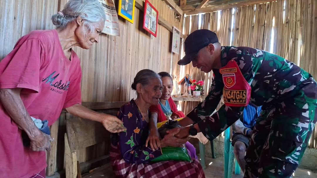 Eban – Prajurit Satgas Pamtas RI-RDTL Sektor Barat Yonarhanud 2 Kostrad dipimpin Wadansatgas adakan pembagian sembako bagi masyarakat perbatasan yang membutuhkan di Desa Eban, Kec. Miomaffo Barat, Kab. TTU. Jumat (10/10)