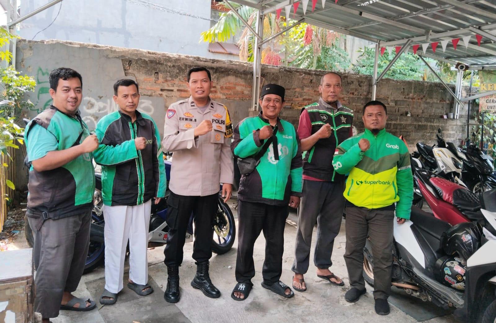 Bhabinkamtibmas Kelurahan Palmeriam, Aipda M. Erwin Sukarla, menyambangi komunitas ojek online yang sedang berkumpul untuk berdiskusi ringan seputar situasi keamanan lingkungan dan dinamika sosial masyarakat.