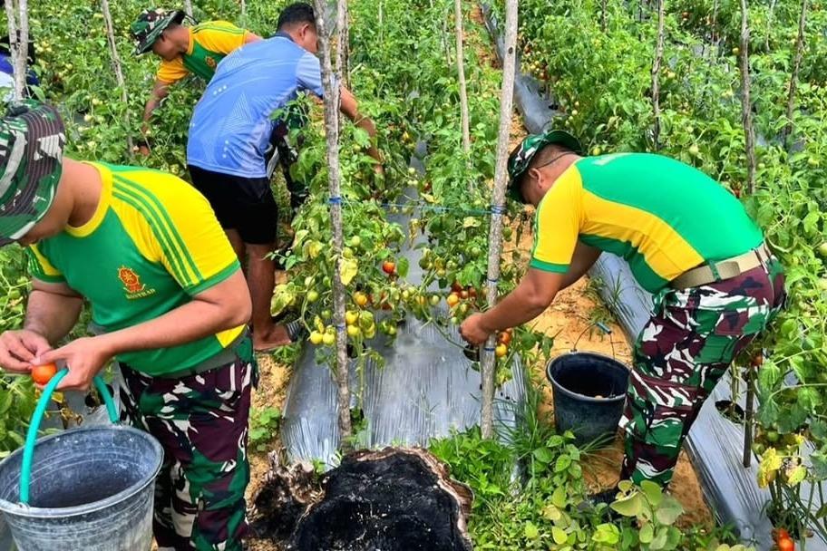 Belu — Pos Lookeu Satgas Pamtas RI–RDTL Sektor Timur Yonarmed 12 Kostrad melaksanakan kegiatan panen tomat bersama masyarakat di wilayah perbatasan Desa Lookeu, Kecamatan Tasifeto Barat, Kabupaten Belu, NTT. Kegiatan ini menjadi momen kebersamaan antara prajurit TNI dan warga dalam mengolah hasil bumi di perbatasan. Senin (10/11/2025).