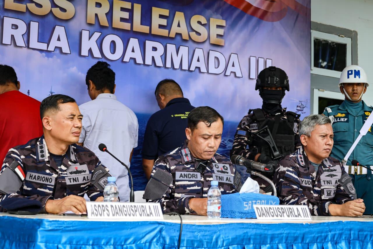 Press Release yang dilaksanakan ini dipimpin langsung oleh Komandan Gugus Tempur Laut (Danguspurla) Koarmada III Laksamana Pertama TNI Andri Kristianto, M.Han., didampingi oleh Asops Danguspurla Kolonel Laut (P) Dr. Hariono, S.H., M.Tr.Hanla., M.A.P., dan Komandan KRI Panah-626 Letkol Laut (P) Yudha Himawan, M.Tr.Opsla.