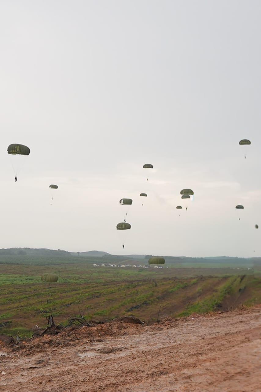 Ratusan penerjun Kostrad dari Yonif 501 Bajrayudha berhasil menguasai sasaran wilayah di Desa Mabat, Provinsi Bangka Belitung, dalam sebuah Operasi Lintas Udara (Linud) yang tepat dan cepat. Itulah skenario latihan yang diperankan oleh Satuan Kostrad pada Latihan Integarsi TNI oleh Mabes TNI, Rabu (19/11/2025).