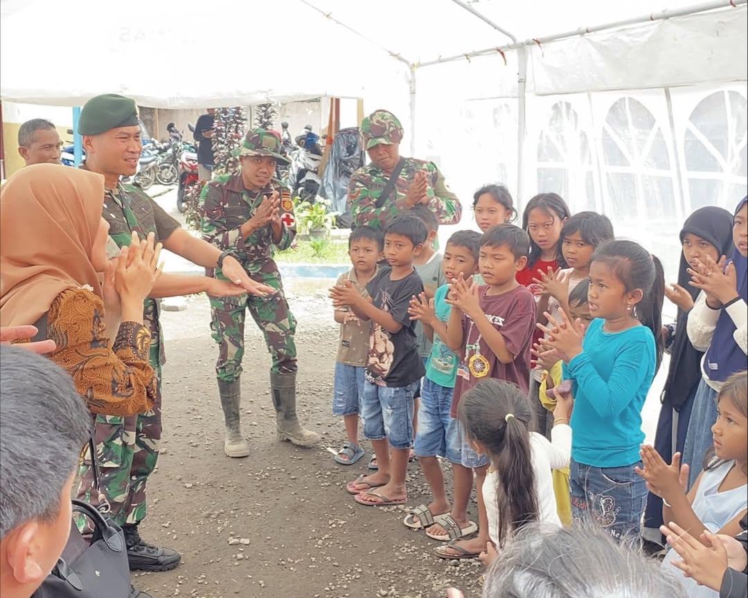 Yonkes 2 Kostrad melaksanakan kegiatan trauma healing bagi anak-anak para penyintas erupsi Gunung Semeru tepatnya di Lokasi SMPN 2 Pronojiwo, Lumajang. Senin (24/11/2025).