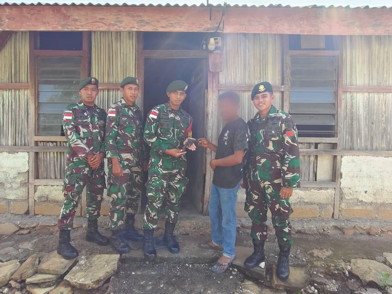 Satgas Pamtas RI–RDTL Sektor Barat Yonarhanud 2 Kostrad, Pos Napan menerima penyerahan satu pucuk pistol rakitan beserta munisi secara sukarela dari warga Desa Napan, Kecamatan Bikomi Utara, Kabupaten Timor Tengah Utara (TTU), Jumat (12/12/2025).