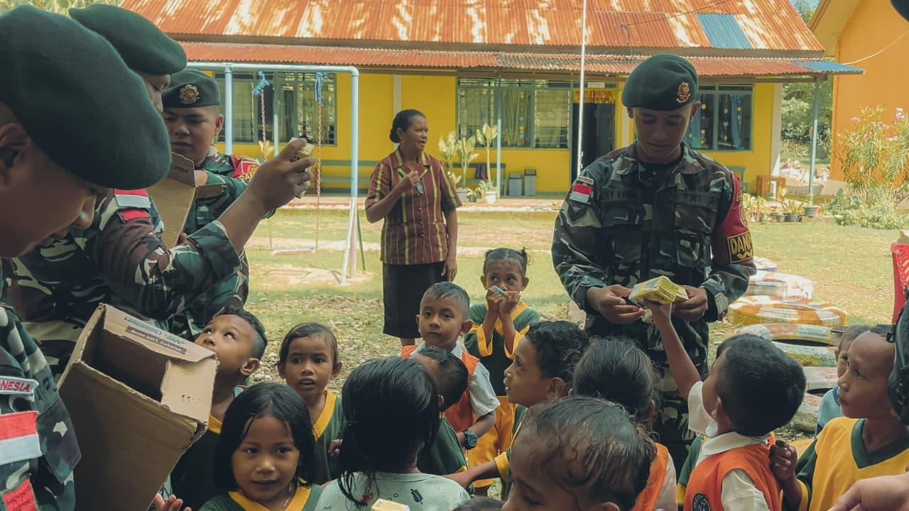 Wini – Sebagai wujud kepedulian sosial terhadap masyarakat di wilayah perbatasan, Satgas Pamtas RI–RDTL Sektor Barat Yonarhanud 2 Kostrad Pos Wini melaksanakan kegiatan berbagi kebahagiaan dengan membagikan makanan berupa nasi, snack, dan susu kepada warga serta anak-anak di Desa Wini, Kecamatan Insana Utara, Kabupaten Timor Tengah Utara (TTU), Jumat (19/12).