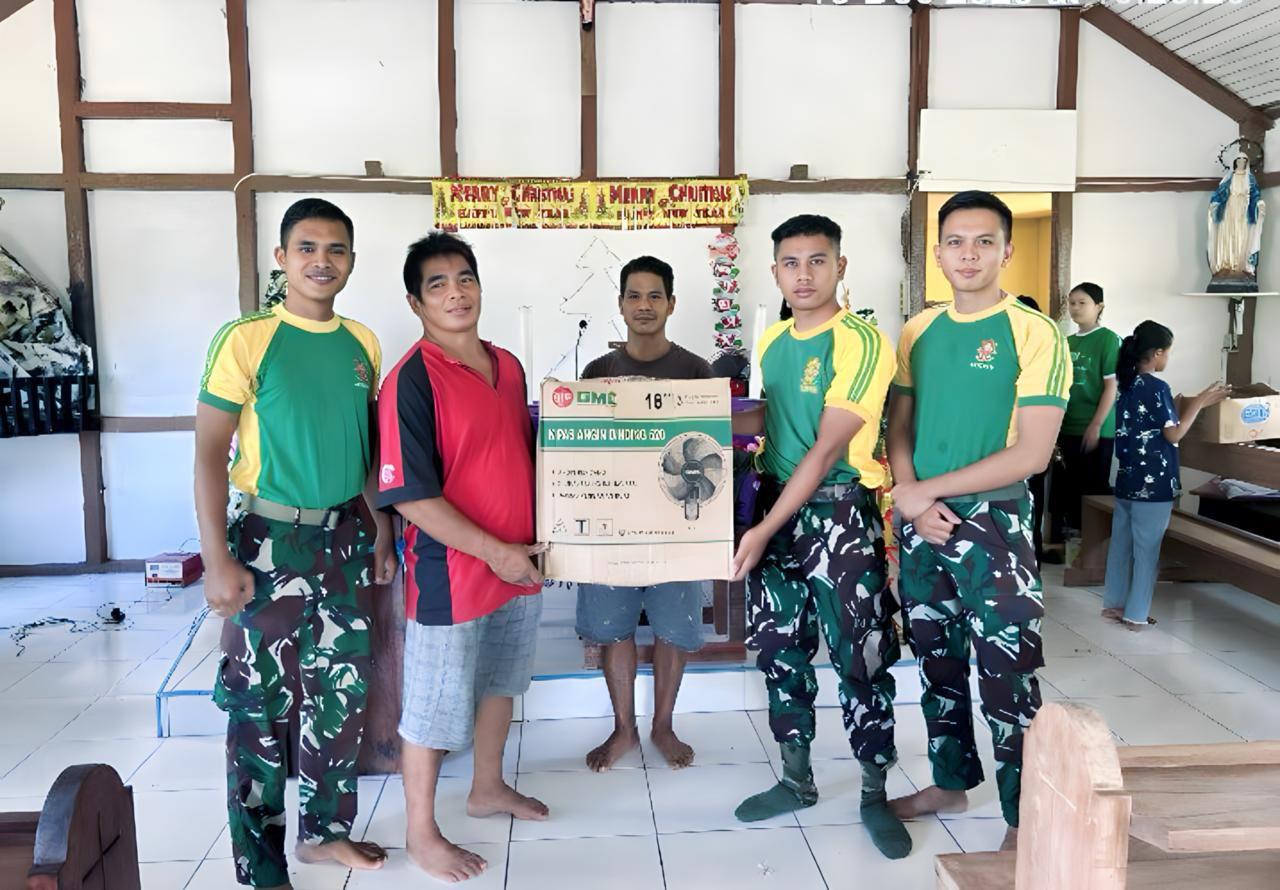 Siding, 19 Desember 2025 — Pos Gunung Anggas Satgas Pamtas RI–Malaysia Yonarhanud 1 Kostrad menunjukkan kepeduliannya terhadap kehidupan sosial dan keagamaan masyarakat dengan memberikan Sargal berupa kipas angin, cat dan hiasan natal serta membantu pelaksanaan dekorasi Gereja St. Lazarus Siding dalam rangka menyambut perayaan Natal 2025.