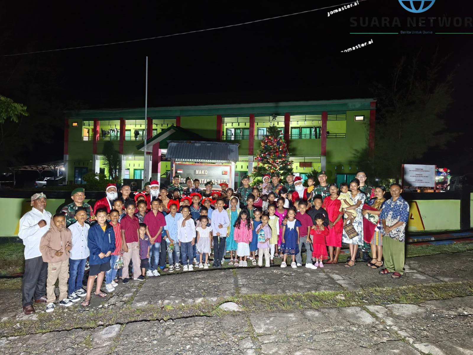Eban – Suka cita dan kebersamaan pada malam Natal di perbatasan, Satgas Pamtas RI-RDTL Sektor Barat Yonarhanud 2 Kostrad hadirkan Kereta Santa Keliling dan Santa Claus di Makosatgas Pamtas, Desa Eban, Kec. Miomaffo Barat, Kab. TTU. Rabu (24/12)