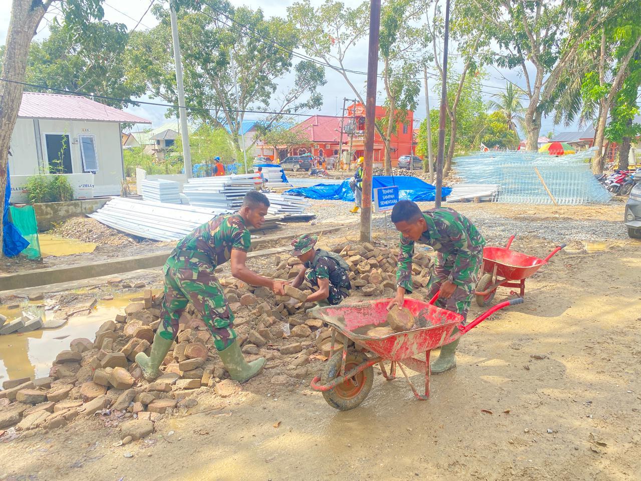 Satuan Tugas Prajurit Batalyon Zeni Tempur 10 Kostrad, membantu pembagunan Hunian Sementara Modular pasca bencana banjir bandang di Kabupaten Aceh Tamiang, Jumat. (09/01/2026).