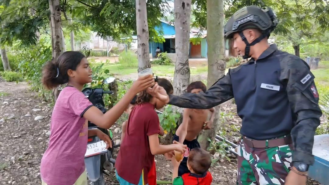 Pererat Kemanunggalan TNI–Rakyat, Satgas Pamtas Yonarmed 12 Kostrad Pos Nunura Berbagi Kolak di Perbatasan
