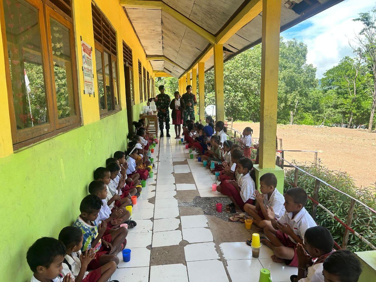 Tasinifu – Satgas Pamtas RI-RDTL Sektor Barat Yonarhanud 2 Kostrad Pos Oelbinose melaksanakan metode pembelajaran yang interaktif sekaligus membagikan bubur gratis di SDN Oelbinose, Desa Tasinifu, Kec. Mutis, Kab. TTU. Jumat (16/1/2026).
