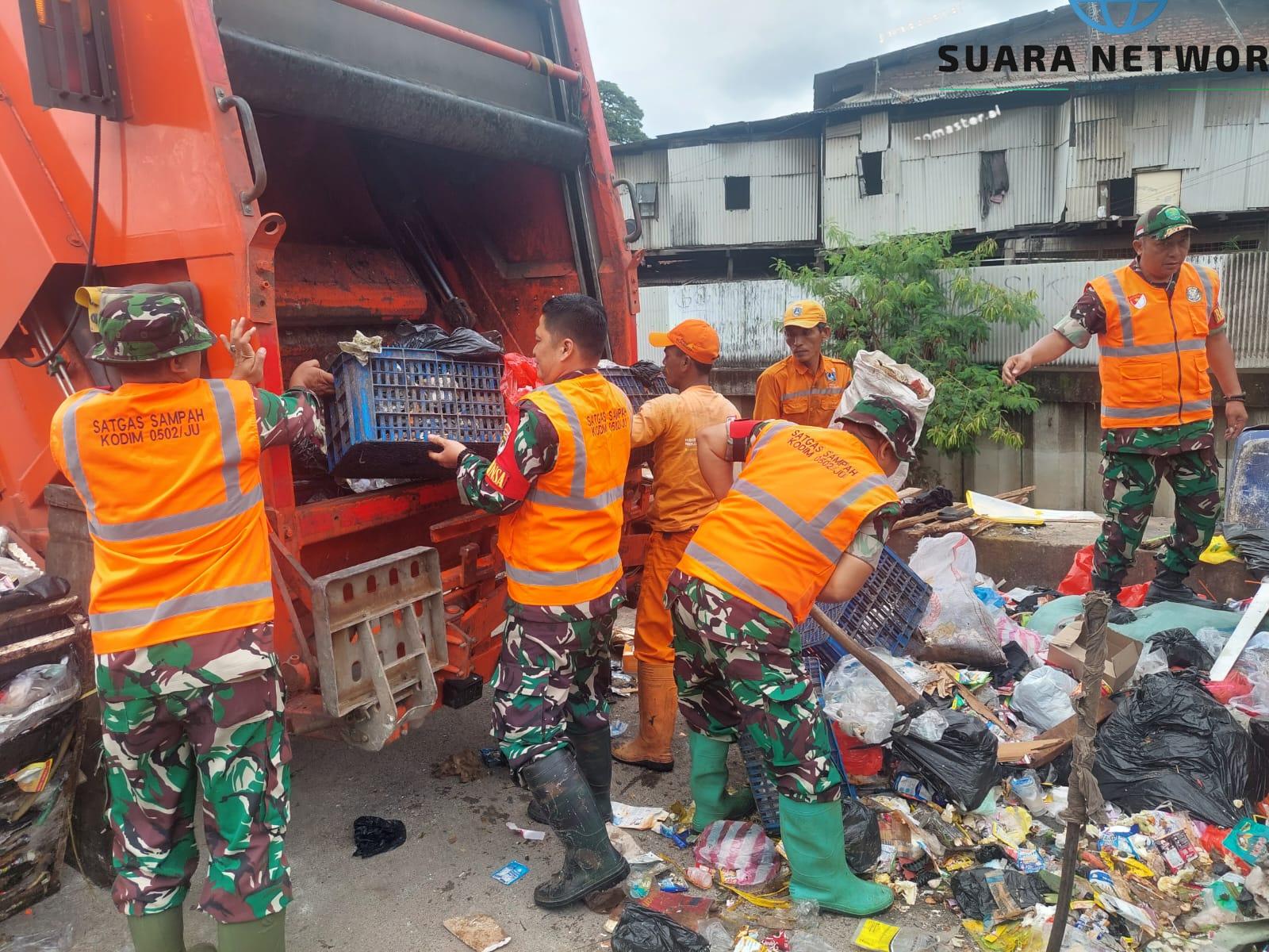 Personel Babinsa Kodim 0502/JU bersama unsur PPSU, Dinas Lingkungan Hidup, serta masyarakat setempat bahu membahu membersihkan tumpukan sampah di sejumlah titik rawan. Berbagai sarana pendukung dikerahkan, mulai dari gerobak sampah, peralatan kebersihan, hingga truk pengangkut sampah, guna mempercepat proses penanganan di lapangan.