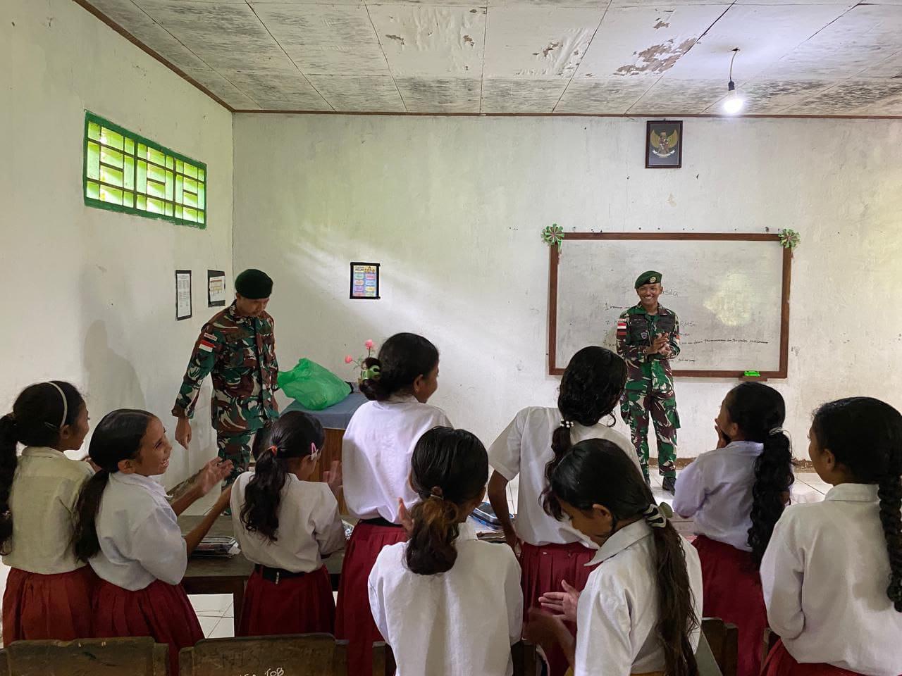 Danpos Naekake, Serka Mohtadi, menyampaikan bahwa kehadiran personel TNI di wilayah perbatasan tidak hanya bertujuan menjaga keamanan, tetapi juga memberikan motivasi dan dukungan bagi generasi muda.