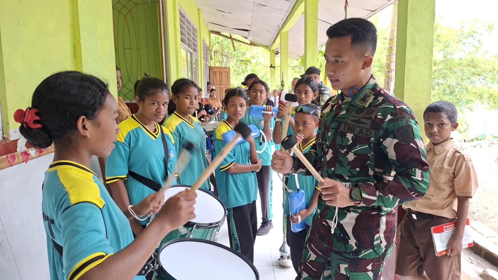Tobu – Satgas Pamtas RI-RDTL Sektor Barat Yonarhanud 2 Kostrad memberikan dukungan tenaga pendidik (Gadik) ajarkan keterampilan bermain Drumband di SMPN Bestaumuti, Kec. Tobu, Kab. TTS. Rabu (28/01/2026).