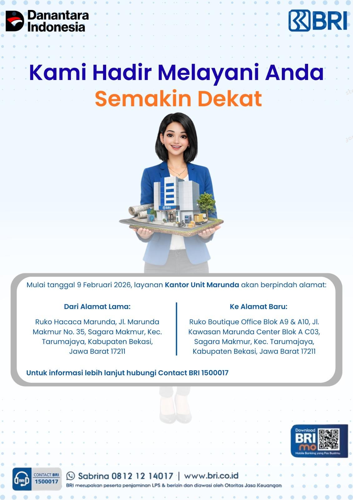 Marunda, KAB. Bekasi, – BRI mengumumkan perpindahan layanan Kantor Unit Marunda ke alamat baru mulai 09 Februari 2026. Relokasi dilakukan untuk memastikan layanan perbankan lebih mudah dijangkau dan operasional semakin terpusat di kantor yang lebih layak.