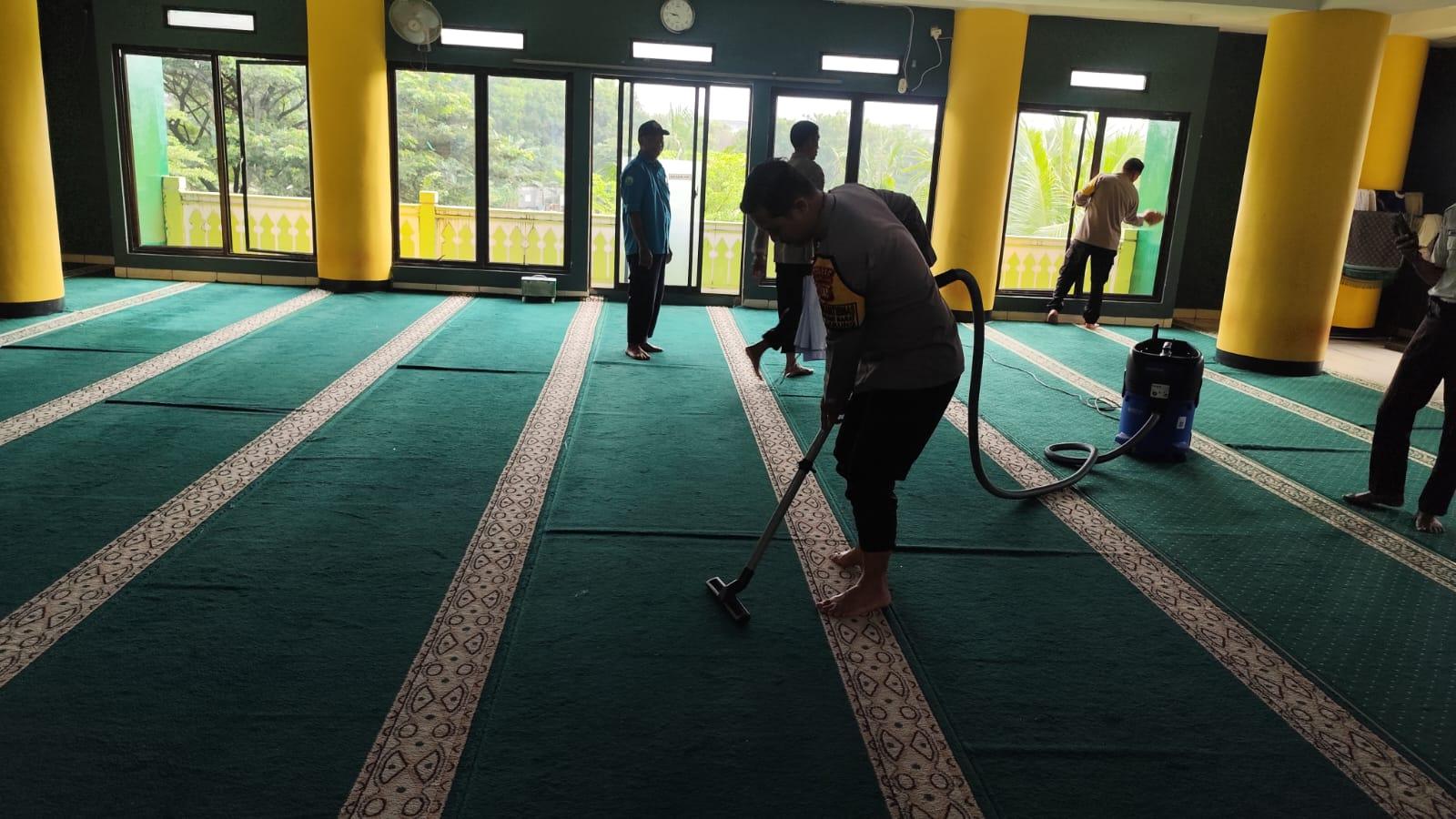Sejumlah personel Unit Binmas Polsek Cakung bersama pengurus DKM dan para jamaah bergotong royong membersihkan area masjid, mulai dari menyapu halaman, mengepel lantai hingga merapikan Al-Qur’an serta perlengkapan ibadah.