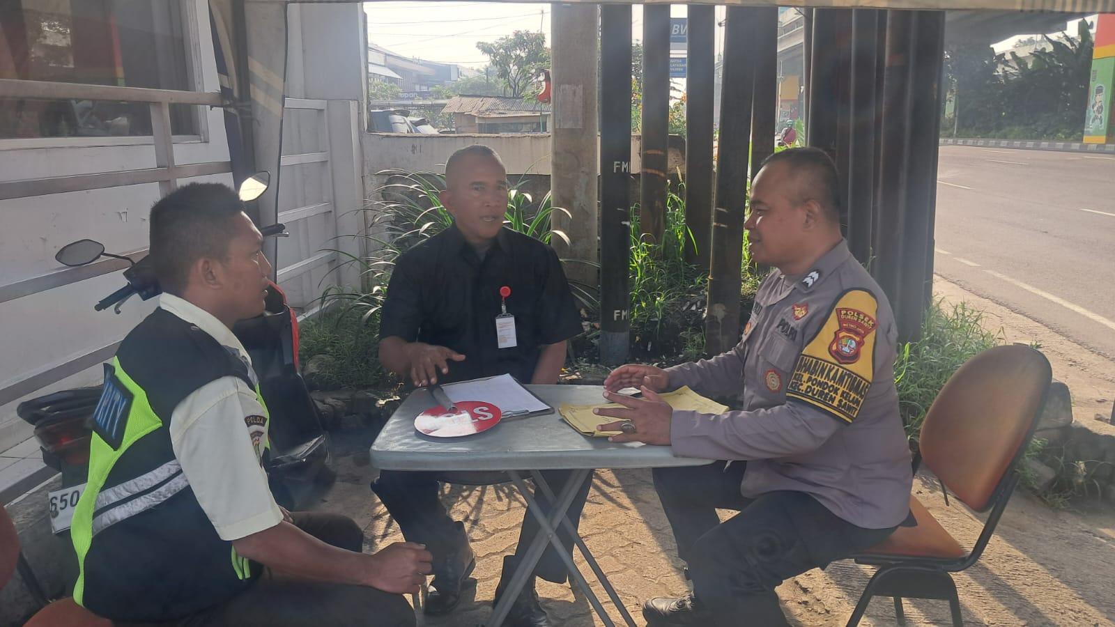 Dalam suasana penuh keakraban, Bhabinkamtibmas Aiptu Fudji Rachmadi berdialog langsung dengan petugas keamanan lingkungan, Bapak Gunawan dan Bapak Yanto.